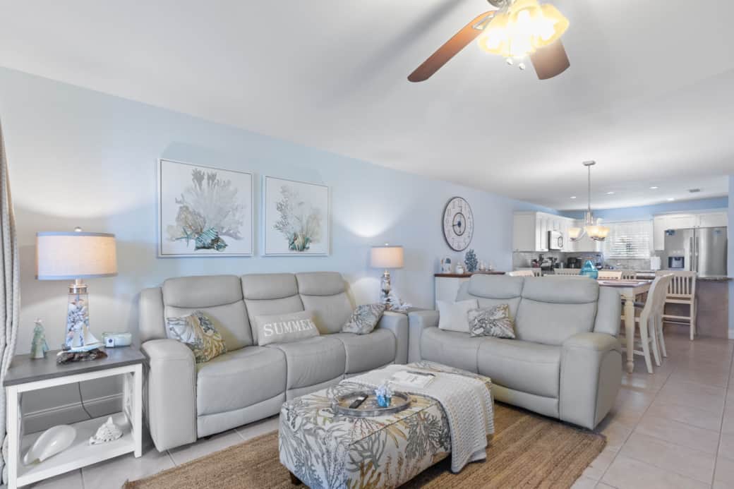 The living room at In My Gulf Era is designed to be a bright, comfortable space where you can truly unwind after a day at the beach.