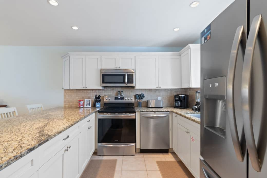 The kitchen at In My Gulf Era is designed to be both functional and inviting—whether you’re preparing a full meal or just brewing your morning coffee before the beach.